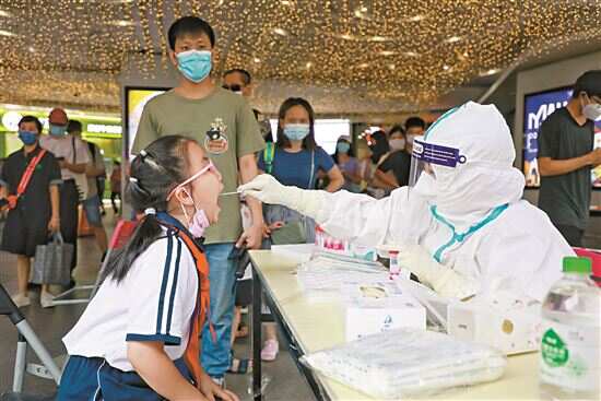 ■7月8日,在沙园街乐峰广场核酸检测点,市民在进行核酸检测。 新快报记者 毕志毅/摄