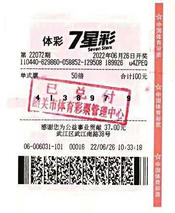 新快报讯 记者陆妍思 通讯员韶关体彩报道 7星彩第22072期开奖中,韶关购彩者凭借一张50倍投的单式票揽获50注三等奖,单注奖金3000元,奖金总计15万元。中奖彩票出自韶关市武江区武江南路38号的4406006031体彩实体店。