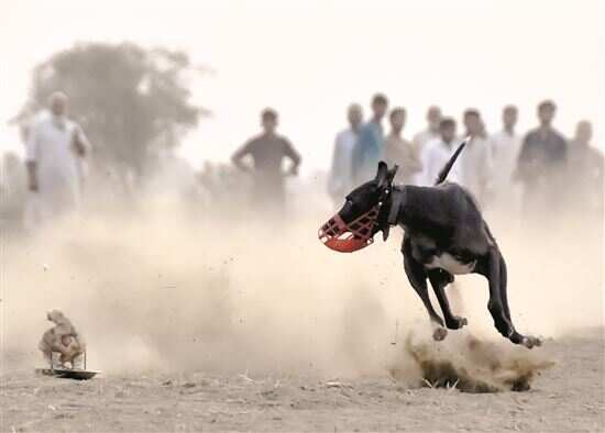 7月3日,在巴基斯坦白沙瓦西北郊一处村庄,人们在传统赛跑活动上观看狗追逐一只机械兔子。新华社发