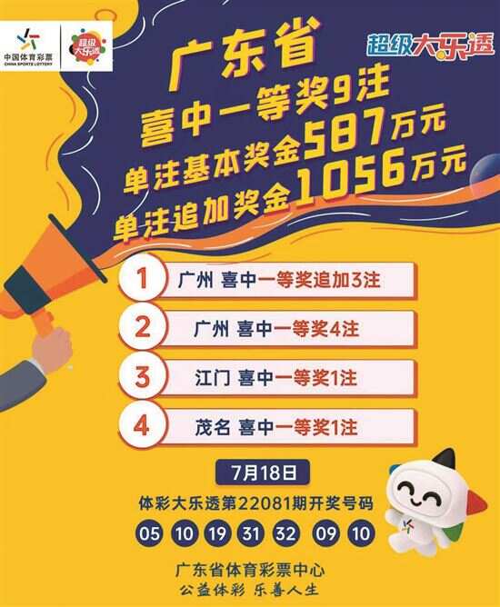 新快报讯 记者陆妍思 通讯员深圳体彩报道 广东彩民狂中9注大乐透头奖!7月18日,体彩超级大乐透第22081期开奖,全国开出11注1056万多元追加一等奖、24注587万元基本投注一等奖,其中3注追加一等奖、6注基本一等奖花落广东,广州元岗横路一家实体店售出的一张彩票独揽3注追加头奖,爆出3170万元巨奖。