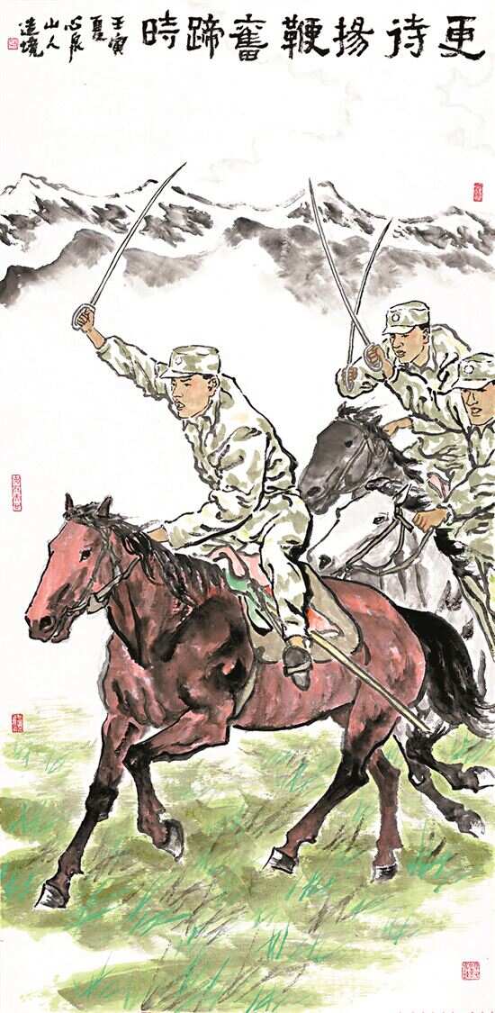 在谈及这次参展的作品时,朱光荣介绍,他创作了边锤部队官兵横刀跃马的国画《更待扬鞭奋蹄时》,表达了对边疆英雄官兵忘我保家卫国的无限敬意,又充满对子弟兵们奉现与付出忘我情怀的敬佩。