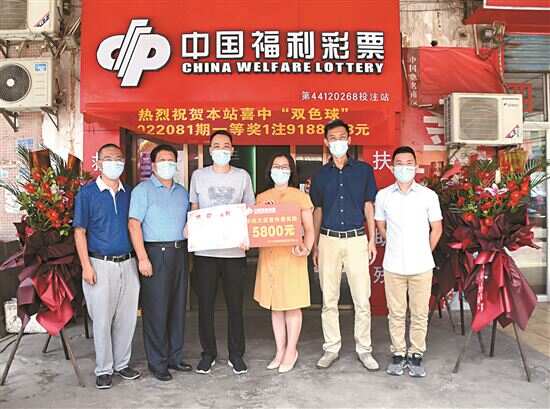 7月20日,江海区南山工业园兴业路1号的44120268投注站鲜花竞放,鞭炮齐鸣。江门市民政局、市福利彩票发行中心,江海区民政局、区福利彩票发行中心共同为该站点中得双色球第22081期一等奖918万元大奖举行庆祝活动。江门市民政局党组成员、副局长林雁冰为销售场所负责人颁发中奖证书和宣传费奖励。