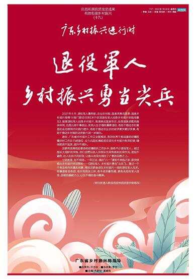 寸阴是竞,时不我待。一年过去,值此“八一”建军节来临之际,新快报推出乡村振兴特别策划——《退役军人 乡村振兴勇当“尖兵”》。通过一个个有血有肉的真实故事,再现这群奋战在乡村振兴一线的退役军人风采。故事里有苦有甜,有乡间的泥土味,有丰收的喜悦感,更有永恒的军人信念、赤诚的奉献之心,以及不竭的奋斗精神。