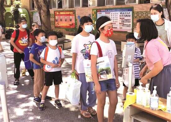 ■暑期校内托管开始,孩子们测温、消毒,排队进入校园。