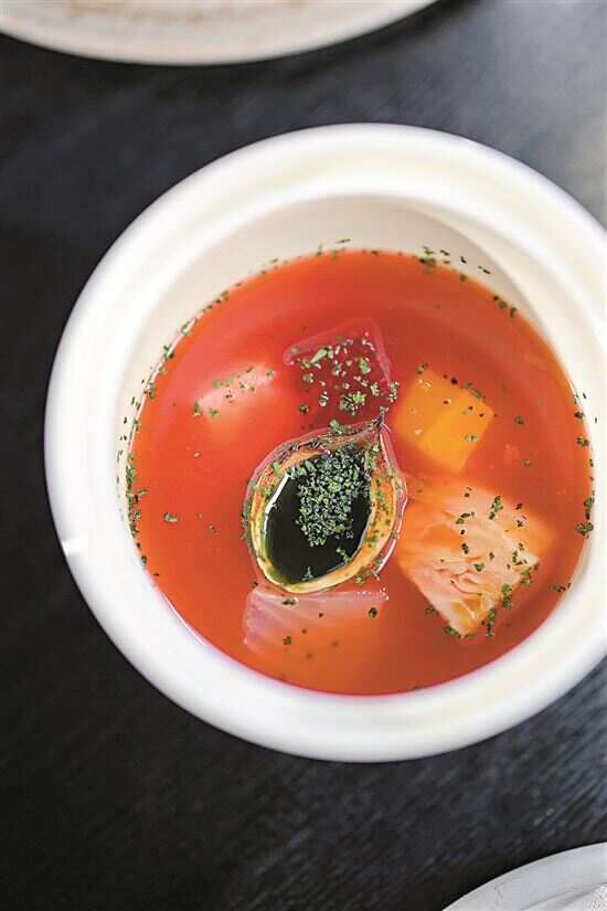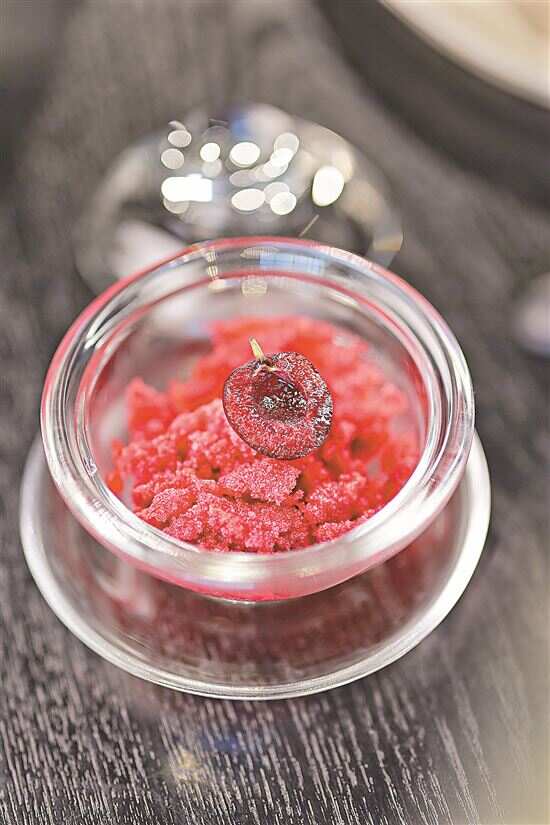 用来清爽口腔的酸樱桃冰沙真是酸得非常清新到位,它还有个迷人的名字叫做“小红帽”,透明玻璃容器中红彤彤的冰沙上半颗樱桃的造型,的确很有“童话”的意境。