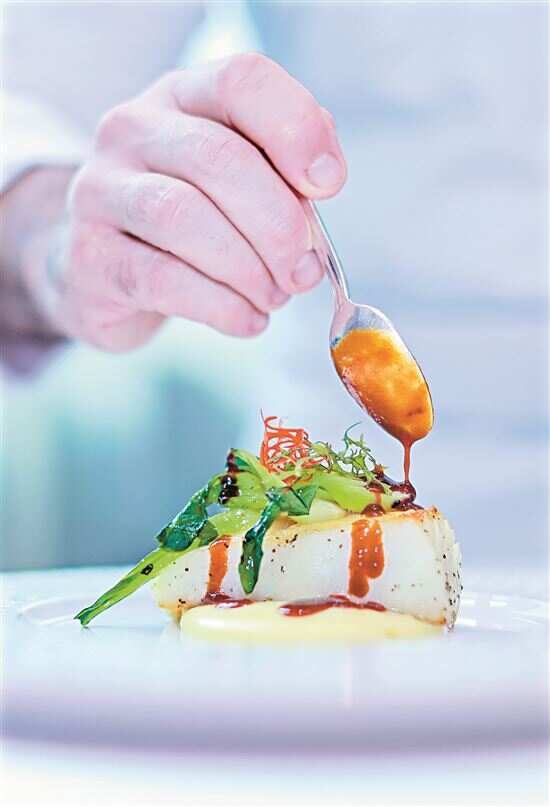 香煎鳕鱼,基本上可以算意轩的经典菜品之一,Diego选用挪威黑鳕鱼,配低温慢煮的土豆蛋黄酱、焦糖甜椒酱和银鱼柳炒小唐菜,最别致的是那味自制甜椒酱,10公斤甜椒才出1公斤酱汁,吃时将甜椒酱汁淋在鳕鱼上,植物的鲜甜与鱼肉的鲜甜相互扶持,直接升华了香煎鳕鱼的“灵魂”……