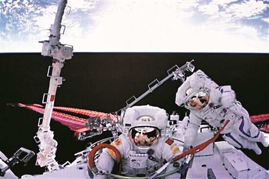 ■神舟十四号航天员刘洋(左)和陈冬圆满完成首次出舱活动全部既定任务。新华社发
