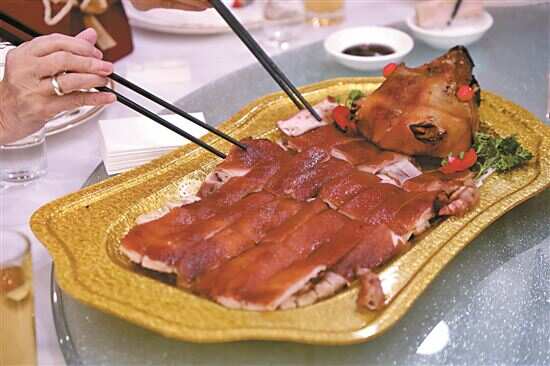 ■广东特色名菜烤乳猪。