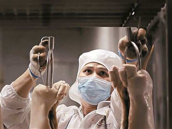 ■工作人员将腌制好的乳猪挂上架子。