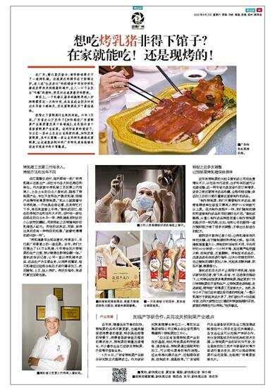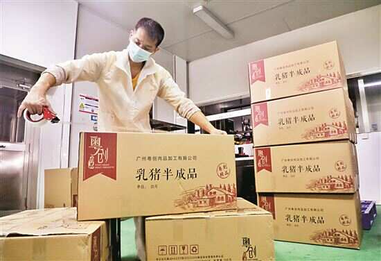 “烤乳猪最早出现在唐宋,传承至今,早已是广府喜宴上的一道名菜。去年,我们大约售出了3.8万头乳猪,今年将会加大预制菜的生产力度,预计销售总数将会翻一倍。”黄钊成告诉记者,公司一直以烤乳猪半成品、成品生产为主要业务,从饲养到屠宰,每只乳猪经过检疫合格后才进行屠宰加工,然后腌制、上叉,挂入烤炉。烤好后催冷,再进行真空压缩包装。