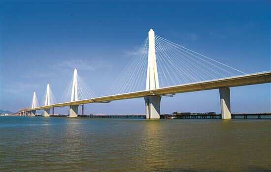 ■5日,粤港澳大湾区重点工程——世界首座公铁同层多塔斜拉桥——珠机城际金海特大桥合龙。大桥全长1369米,宽49.6米,中间为时速160公里的双线城际铁路,两侧为时速100公里的双向六车道高速公路。新华社发
