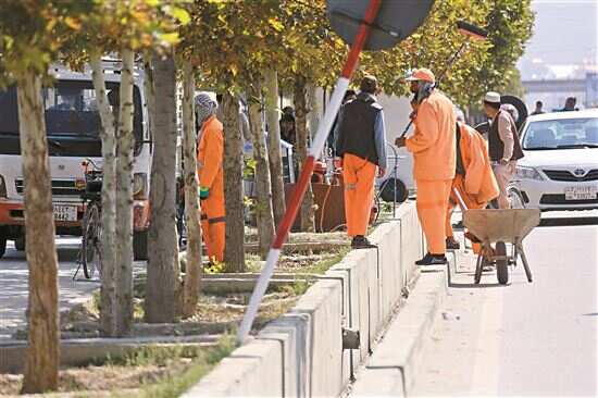 9月5日,阿富汗市政工人在喀布尔爆炸现场附近工作。