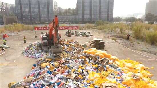 ■2019年11月,白云区举行打击制售假冒伪劣商品违法行为专项整治暨罚没物品集中销毁现场会,在现场共销毁假冒伪劣商品10万余件,总重100余吨,货值超过1亿元。通讯员供图
