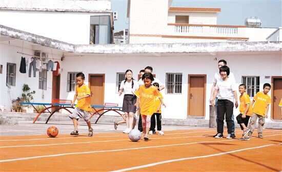 公开课之后,支教志愿者、采风团领导嘉宾与梅塘平安希望小学的孩子们展开一场趣味的足球赛。在本批支教志愿者队长莫金平的组织带动下,热身、带球、传球……跑道上的趣味足球运动让大小朋友们不亦乐乎。