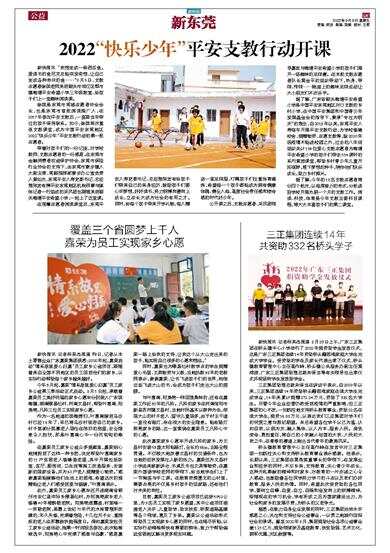 据了解,广东省韶关梅塘平安希望小学是中国平安东莞地区对口支教的乡村小学,在中国平安集团和中国青少年发展基金会的指导下,秉承“专注为明天”的理念,自2013年以来,东莞平安人寿每年开展平安支教行动,为学校修缮校舍、捐赠物资、志愿支教等,除2020年因疫情不能进校园之外,过去的八年间组织共计184位爱心支教志愿者为梅塘平安希望小学的孩子们带去514课时的系列素质课堂,帮助乡村青少年儿童开拓视野,埋下梦想的种子,陪伴他们快乐成长,助力乡村振兴。