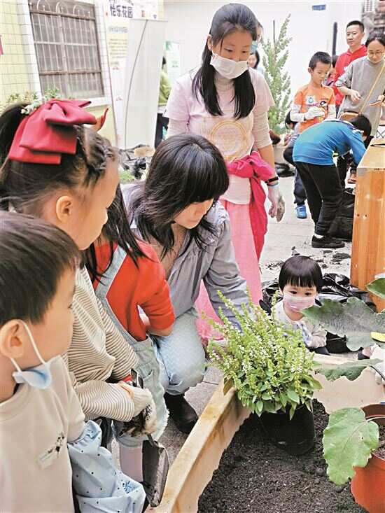 无独有偶,在深圳市坪山区坪山街道六联社区的一所幼儿园内,园长曾婷婷和孩子们一起开辟出小花园,种下花草和蔬菜,还把种子和树苗送给大家带回家继续种植。