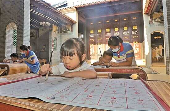 书法课上,小朋友在写毛笔字。