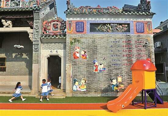古楼与滑梯,看起来毫无违和感。