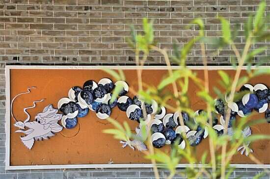墙壁挂着小朋友美术课的作品,这是用环保餐盘画制拼接的龙。