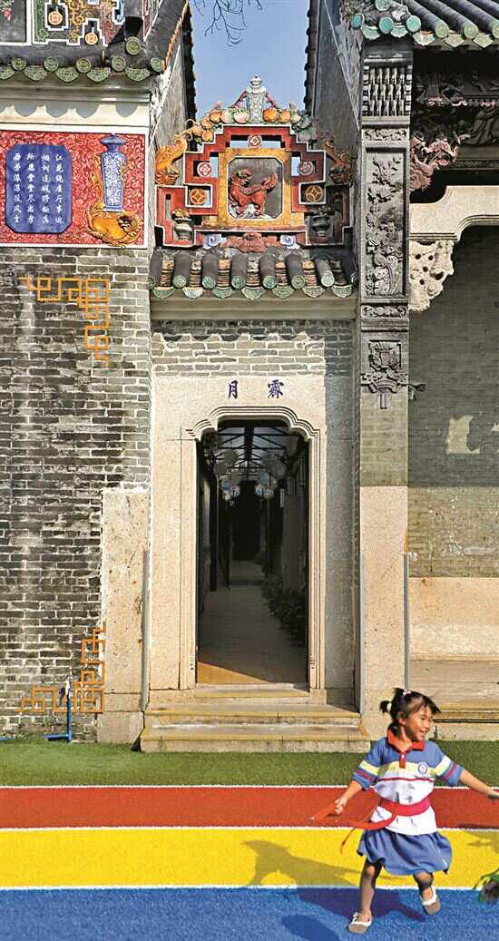 灰墙,黄瓦,精美花鸟瓷砖画,古韵十足,而彩色跑道又充满了现代感。