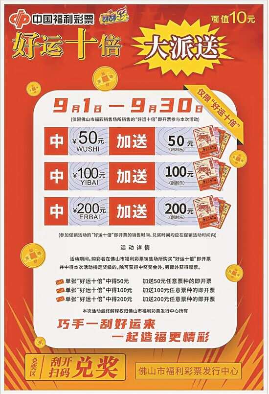 佛山刮刮乐“好运十倍”大派送活动贯穿整个9月,活动期间,购彩者在佛山市福利彩票销售场所购买“好运十倍”即开票并中得本次活动指定奖级的,除可获得中奖奖金外,另额外获得赠票。具体为单张中得50元/100元/200元,除可获得票面奖金外,加送50元/100元/200元任意票种即开票。