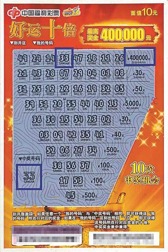 “我们一边哼着小曲,一边刮彩票,很快有张彩票中了50元,除了获得奖金50元,还加送50元任意票种的刮刮乐,体验到了活动的乐趣后,我们刮得更起劲了,没想到还有更大的惊喜在等着我们。”“刮开‘中奖号码’是‘33’,紧接着我刮开‘我的号码’,没想到才刮开第一行就出现了‘33’,后面对应的奖金居然是‘¥400,000’,我的心提到了嗓子眼,赶紧拿给朋友看,大概是紧张,说话都结结巴巴的,朋友看后更是开心得跳了起来。突如其来的40万大奖,把我们‘砸’得晕头转向!”小陈乐呵呵地说。