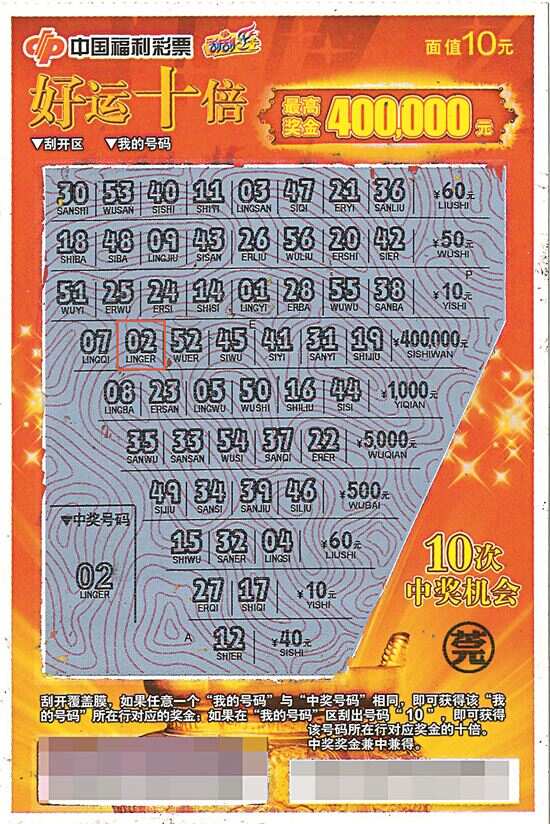 刮中“好运十倍”头奖的小陈(化名)是位仅有两年彩龄的年轻彩民,这一次能刮中40万元大奖,小陈直呼“真是超级幸运”!中奖当天,小陈和朋友来到投注站,销售员刘女士积极推荐刮刮乐“好运十倍”大派送活动,他们一下就被活动吸引了,毕竟“好运十倍”是刮刮乐彩票游戏中王者般的存在,他们还听说该票种多年来一直蝉联刮刮乐游戏单品种年度销售冠军,妥妥的10元票“人气王”,如今中得本次活动指定奖级的,除可获得中奖奖金外,另可额外获得赠票。