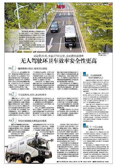 另据了解,全无人驾驶环卫车于2022年4月开展公开道路测试。经统计,在4个月的测试中,相比传统环卫作业模式,纯电动无人环卫车低碳环保,平均节省57%的人力。
