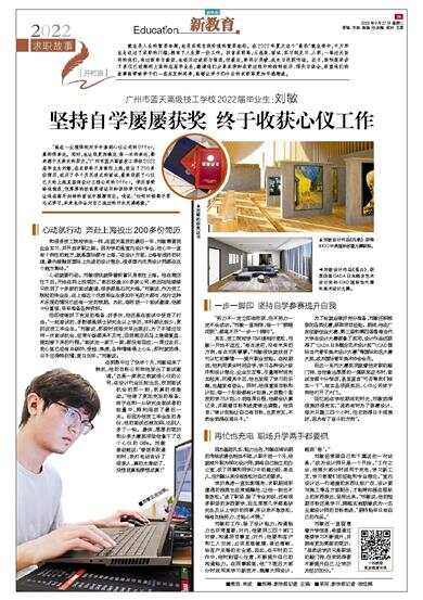 “能在一众强悍的对手中拿到心仪公司的Offer,真的很幸运。同时,也让我更加确定:每一次的幸运,都来源于无数次的努力。”广州市蓝天高级技工学校2022届毕业生刘敏,在求职季只身前往上海,投出了200多份简历,经历了半个月沉浸式的面试,最终收获了心仪已久的上海某装饰设计工程公司的Offer。学历曾带给他焦虑,但厚厚的技能奖项证书和保持学习的信念,让他在高手如林的面试中脱颖而出。他说:“任何时候都不要忘记学习,未来也许会对自己流过的汗水充满感激。”