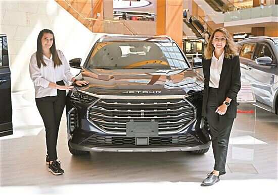 ■两名女子在科威特哈瓦利省的中国车展上展示汽车。新华社发