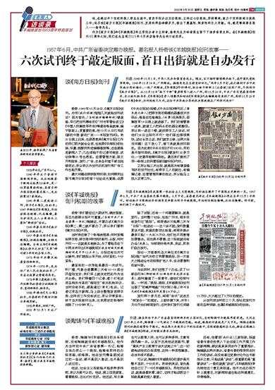 杨奇:我们要经过六期试刊,确定版面,而且内容跟日报不可重复。(当时中共广东省委第一书记)陶铸说,不要办成《南方日报》第二,第二就不要办了,所以我们要和《南方日报》不同。