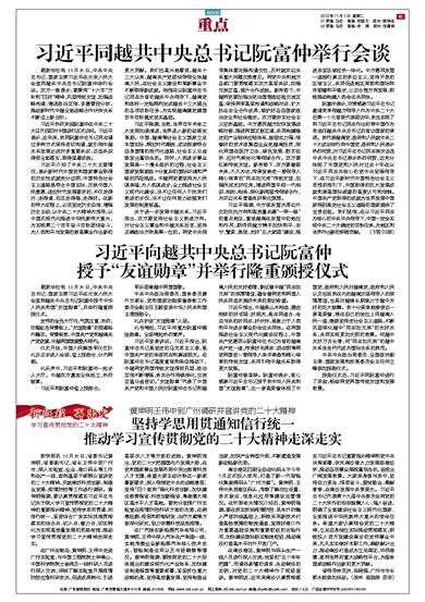 新快报讯 10月31日,省委书记黄坤明,省委副书记、省长王伟中到广州市,深入实验室、企业、港口码头等工作和生产一线,面向基层干部群众宣讲党的二十大精神,并就做好科技创新、制造业发展、疫情防控等工作进行调研。黄坤明强调,要认真贯彻落实习近平总书记关于深入学习宣传贯彻党的二十大精神的重要指示精神,坚持学思用贯通、知信行统一,紧密结合广东实际找准贯彻落实的结合点、切入点、着力点,切实转化为实现高质量发展的思路举措,推动学习宣传贯彻党的二十大精神走深走实。