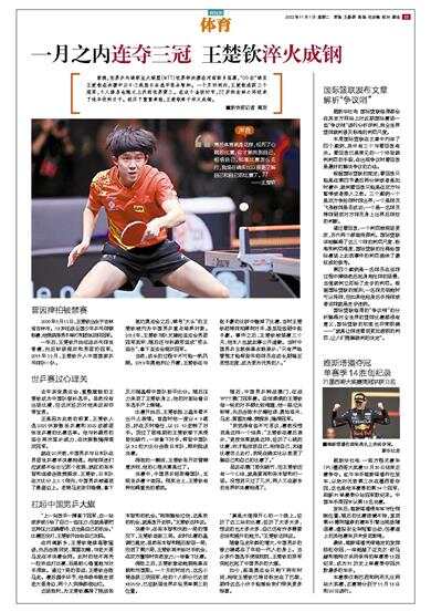 前晚,世界乒乓球职业大联盟(WTT)世界杯决赛在河南新乡落幕,“00后”球员王楚钦在决赛中以4∶2战胜日本选手张本智和。一个月时间内,王楚钦连获三个冠军,个人排名也随之上升到世界第三。在这个金秋时节,22岁的吉林小将迎来了他丰收的日子。经历了重重考验,王楚钦终于淬火成钢。