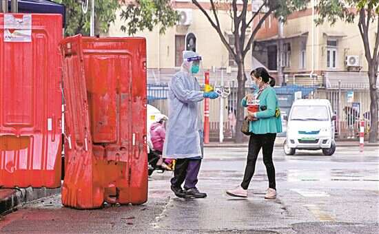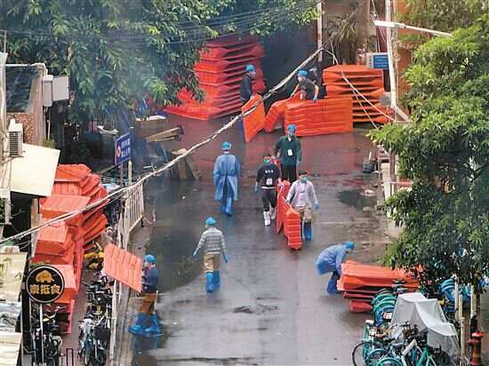 ■7日10时40分许,海珠区赤岗街道下渡社区部分区域实行临时管控,多名工作人员在搬运物品。