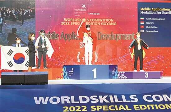 ■杨书明登上2022年世界技能大赛特别赛移动应用开发项目金牌领奖台。