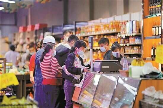 ■9日晚,广州番禺区钟村街市民在采购物资,目前番禺粮油肉菜供应、生活超市(含农贸市场)等行业和场所均正常运行,市场物资充足。新快报记者 郭思杰/摄