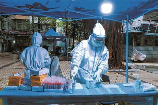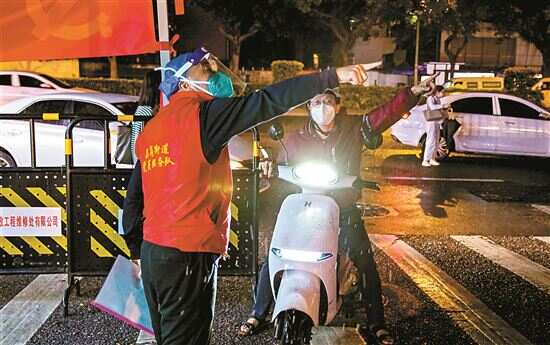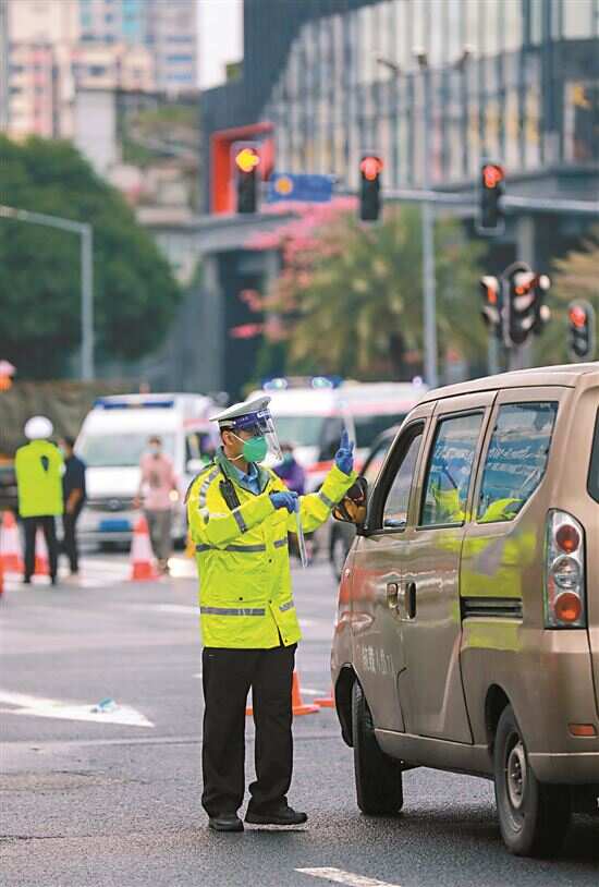 ■在广州海珠区防控区内,志愿者、公安交警、医护人员、快递小哥、环卫工,他们穿着不同颜色的衣服,却承担着相同的使命——守护这座城。新快报记者 龚吉林/摄