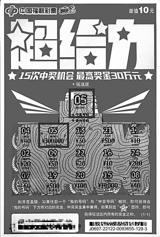 “超给力”是多种面值系列票,面值分10元、20元、50元,头奖分别为30万元、80万元、100万元。这次30万元大奖获得者周先生(化名)购买的正是10元票。