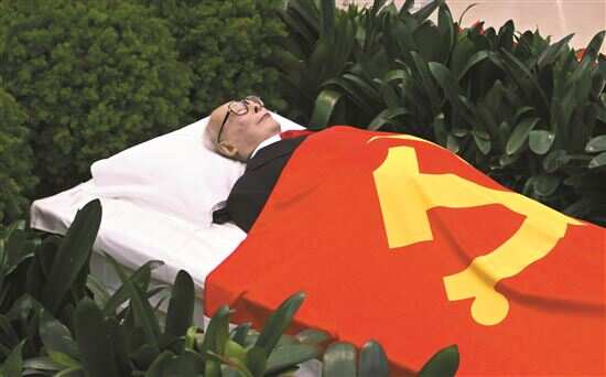 ■12月5日,江泽民同志的遗体安卧在鲜花翠柏丛中,身上覆盖着鲜红的中国共产党党旗。新华社发