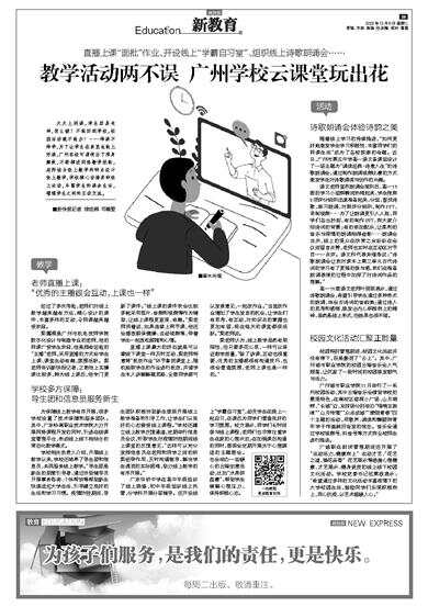 天天上网课,学生容易走神,怎么破?不能回到学校,校园活动就不能办?……停课不停学,为了让学生在家里也能上好课,广州各校可谓使出了浑身解数,不断精进网络教学技能,老师结合线上教学的特点设计线上教学,学校精心安排多种线上活动,丰富学生的课余生活,增强学生之间的互动交流。