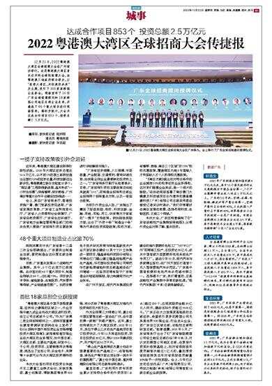 12月21日,2022粤港澳大湾区全球招商大会在广州南沙举行。这是粤港澳大湾区首次召开的全球性招商大会,由粤港澳三地政府联合举办,以“投资大湾区,共创美好未来”为主题,吸引了300多家跨国企业参会。现场宣布了16位广东全球招商顾问和18家跨国公司地区总部企业名单,并遴选了48个重大项目进行现场签约。据初步统计,大会共达成合作项目853个、投资总额2.5万亿元。