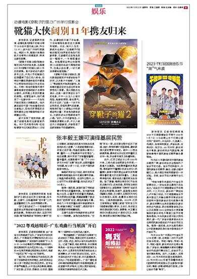 新快报讯 记者梁燕芬报道 动漫电影《穿靴子的猫2》将于23日在中国内地上映,昨日(21日),该片在广州举行观影会。阔别11年,靴猫大侠集结软爪吉蒂和小狗佩里多,带来全新的故事。