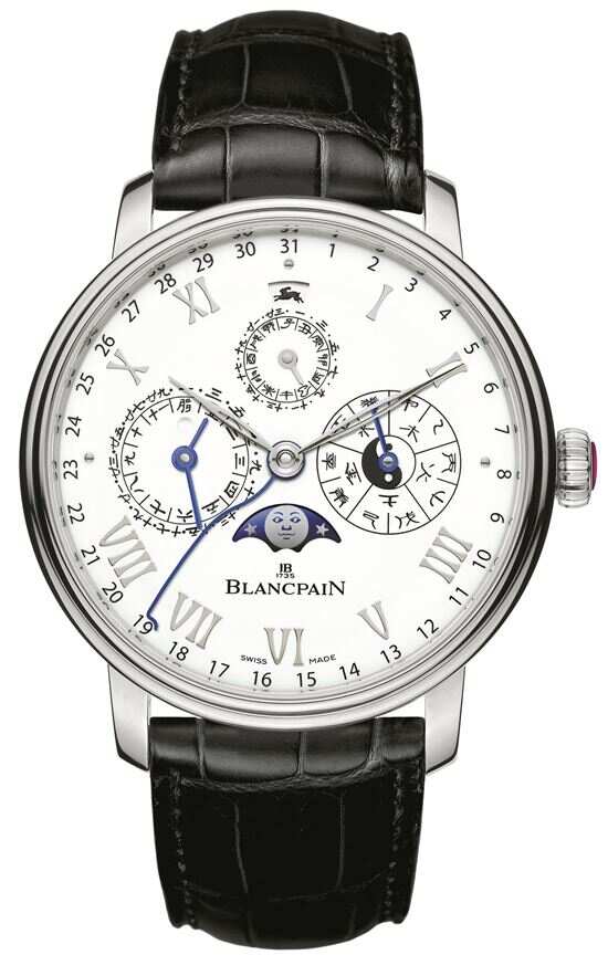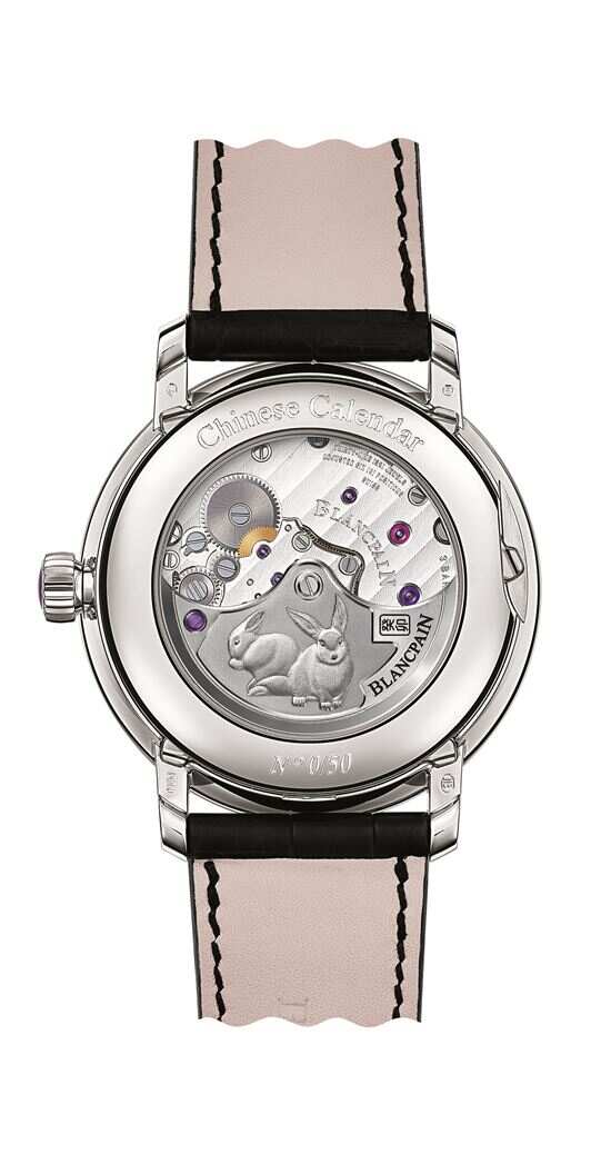 2012年农历壬辰龙年起,宝珀Blancpain推出经典V系列中华年历限量款腕表,至癸卯兔年恰好是完整的十二生肖限量款作品。“宝兔”腕表由铂金打造而成,限量发行50枚,表盘上呈现了干支纪年、阴阳合历、十二时辰、生肖五行等中华年历独有显示功能,摆陀上还镌刻有一对栩栩如生的宝兔图案,彰显温柔与信任两大主题。