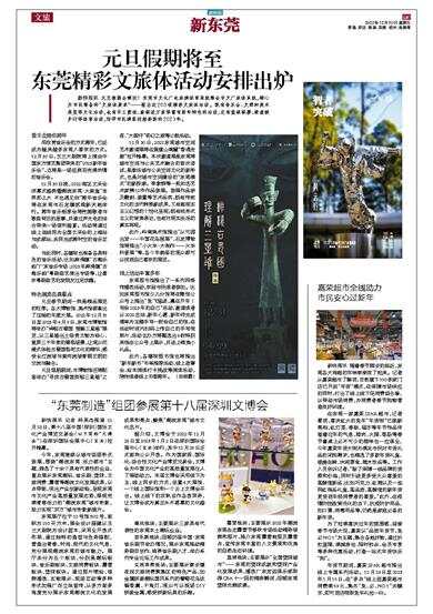 新快报讯 元旦假期去哪玩?东莞市文化广电旅游体育局统筹全市文广旅体系统,精心为市民筹备的“文旅体菜单”——推出近200项精彩文旅体活动。既有音乐会、文博和美术展览等文化活动,也有手工剪纸、春联进万家等富有新年特色的活动,还有篮球联赛、绿道健步行等体育活动,陪伴市民游客迎接崭新的2023年。