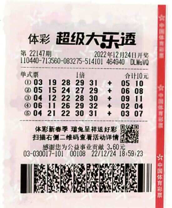 新快报讯 记者陆妍思 通讯员珠海体彩报道 2022年12月24日,超级大乐透第22147期开奖中,珠海市香洲区广昌市场7号铺的4403030017体彩实体店中出1注一等奖,中奖彩票为一张5注号码、10元投入的单式票,揽获1注一等奖和九等奖,总揽奖金1000万余元,为珠海贡献税收200万元。
