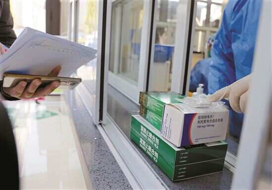 ■1月4日,在上海市松江区九亭镇社区卫生服务中心发热门诊,药房人员在窗口向患者家属发药,其中就有Paxlovid。新华社发