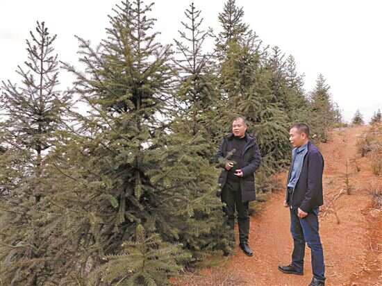 ■春节前,大路边镇党委书记黄斌洪(左)与黄军庆一同前往大塘村查看树木的生长情况。