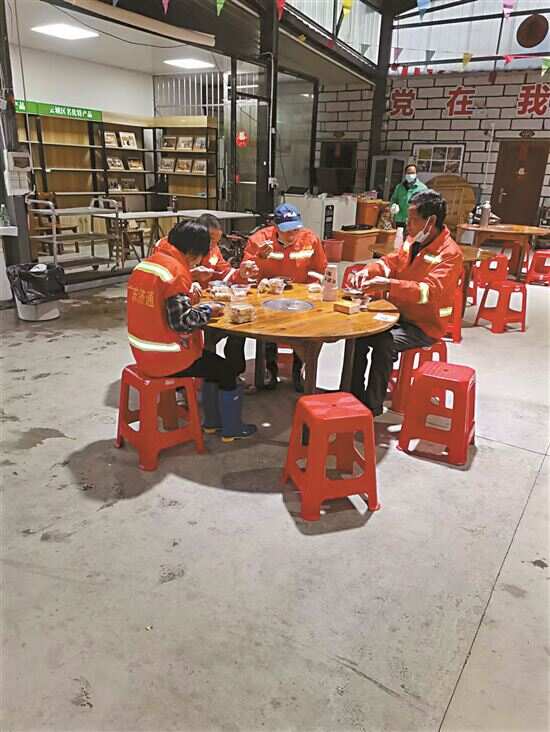 ■环卫工人在前锋镇爱心早餐餐厅享用免费早餐。