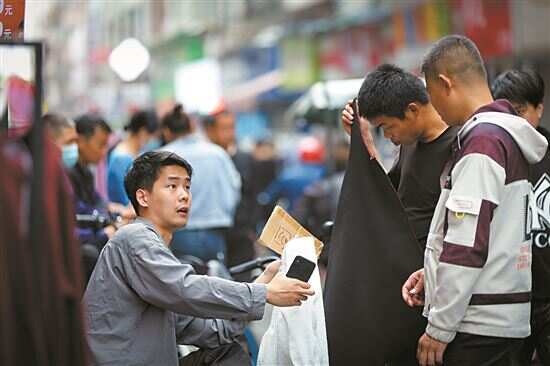 ■为了让求职者看得更仔细,一名招工者干脆举起了样衣。