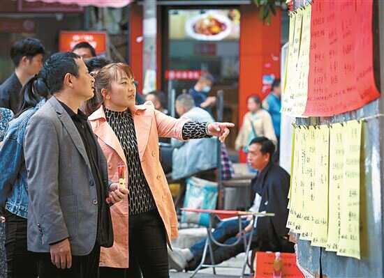 ■街边的招工栏里贴满了各种各样的招工信息,求职者会驻足查看有用的信息。